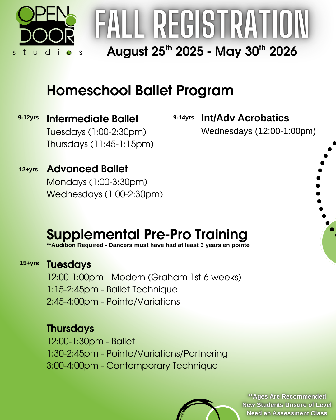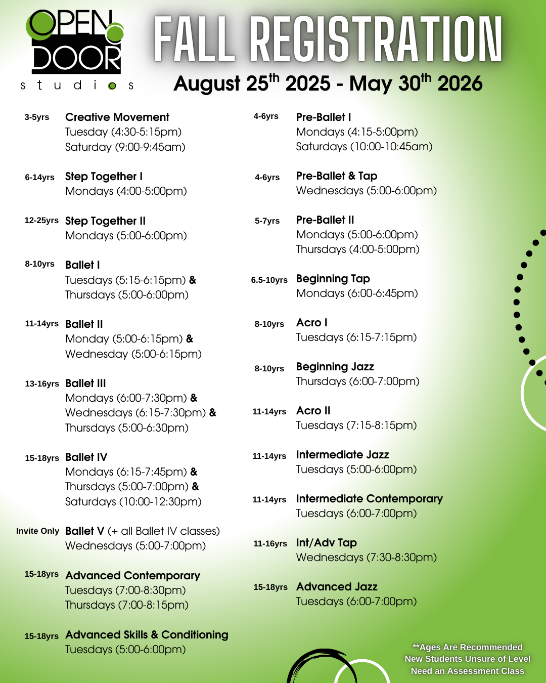 Attendance Policy: Parents and students are encouraged to avoid making appointments during class time. Students who miss class regularly will be moved into a lower class level in order to maintain the integrity of each class’s curriculum. Parents must notify Open Door Studios if their child is going to be absent. Missed classes should be made up within 1 month after the missed class or even arranged prior to if you know ahead of time. Missed classes do not rollover into our Summer Session or the following season.
